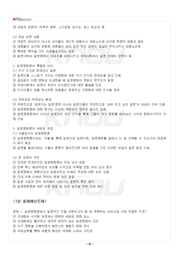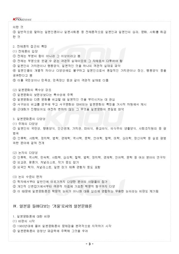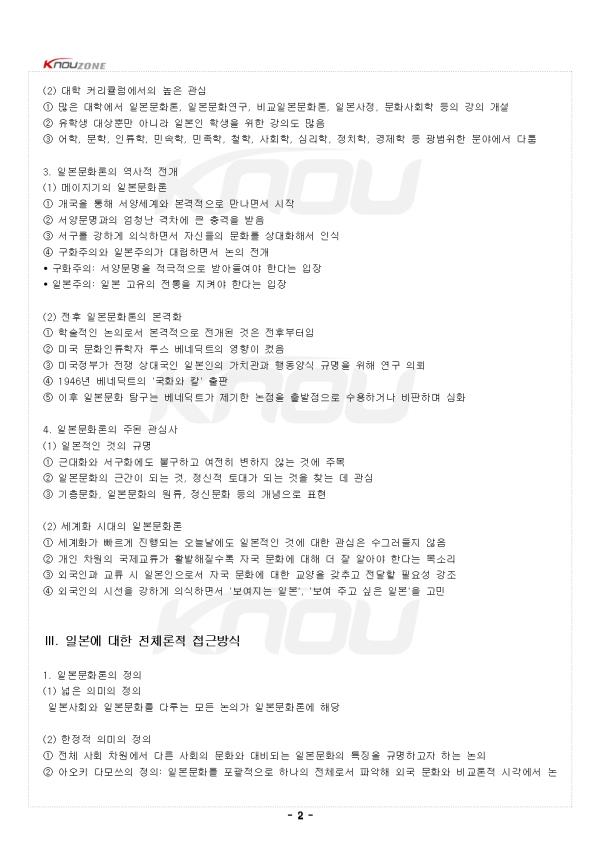 ¥°. À̹®È¿¡ ´ëÇÑ ¿øÃÊÀû È£±â½É 1. ÀϺ»¹®È¿¡ ´ëÇÑ °ü½ÉÀÇ ÀÚ¿¬½º·¯¿ò (1) ÀϺ»ÀÎÀÇ ±¹¹Î¼º°ú °¡Ä¡°ü¿¡ ´ëÇÑ Àǹ® ¨ç ÀϺ»ÀεéÀÇ ±¹¹Î¼º, °¡Ä¡°ü, Çൿ¾ç½Ä¿¡ ´ëÇÑ ÀÚ¿¬½º·¯¿î ±Ã±ÝÁõ ¨è µ¿¾Æ½Ã¾Æ ¹®È±ÇÀ¸·Î¼ Çѱ¹°úÀÇ À¯»çÁ¡°ú Â÷ÀÌÁ¡¿¡ ´ëÇÑ °ü½É ¨é ¸Å½ºÄÄ º¸µµ, ÀϺ»ÀΰúÀÇ ±³·ù °æÇè, ÀϺ» ü·ù °æÇè µîÀ» ÅëÇØ ¹®ÈÀû Â÷ÀÌ ÀÎ½Ä (2) ÀϺ»¹®È °ü·Ã ÃâÆÇ¹°ÀÇ ¹ü¶÷ ¨ç ´ëÇü¼Á¡¿¡ ©¸·ÇÑ ¿©Çà±â·ÏºÎÅÍ Çмú¼Àû±îÁö ´Ù¾çÇÑ ÀϺ» °ü·Ã µµ¼ Á¸Àç ¨è ³íÀÚµµ ¿©ÇàÀÚ, ÁÖÀç¿ø, ±âÀÚ, Æò·Ð°¡, ±³¼ö, ¿¬±¸ÀÚ µîÀ¸·Î ¸Å¿ì ´Ù¾çÇÔ ¨é ÀÌµé ³íÀÇÀÇ °øÅëÁ¡Àº Çѱ¹¹®È¿Í ´ëºñµÇ´Â ÀϺ»¹®ÈÀÇ Æ¯Â¡À» ´Ü¼øÈ½ÃÄÑ ÆÄ¾ÇÇϰíÀÚ ÇÔ 2. ¹®È·ÐÀû Á¢±ÙÀÇ Æ¯Â¡°ú ÇѰè (1) ¹®È·ÐÀÇ ¼³µæ·Â ¨ç ÇÑ »çȸÀÇ µ¶Æ¯ÇÑ ¹®ÈÀû ƯÁú¿¡ ±âÃʸ¦ µÐ ¼³¸íÀº ¸Å¿ì ¼³µæ·ÂÀÌ ÀÖÀ½ ¨è ºñ±³´ë»óÀÌ µÇ´Â ¹®È´Â ÀÚ¹®È¿¡ ´ëÇÑ °Å¿ïÀÇ ¿ª»óÀ¸·Î ÀÛ¿ë ¨é Ÿ¹®È¿¡ ´ëÇØ¼´Â ÅëÇÕÀûÀ̰í ÀϰüµÈ »óÀ» ±×·Á³»±â ¿ëÀÌÇÔ ¨ê Àΰ£ÀÇ ¸¶À½Àº ÅëÇյǰí ÀϰüµÈ »óÀ» ´õ ½±°Ô ¼ö¿ëÇÏ´Â °æÇâ (2) ¹®È·ÐÀÇ º»ÁúÀû ÇÑ°è ¨ç ¹®È·ÐÀû ¼³¸íÀº º»ÁúÀûÀ¸·Î ¼±ÅÃÀûÀÓ ¨è ¼ø¼öÇÑ ¼³¸íÀ» Ãß±¸ÇÒ¼ö·Ï ¸ð¼øµÇ´Â »ç·Ê´Â ¹«½ÃÇÏ°í ºÎ°¢½ÃŰ°í ½ÍÀº Ãø¸é¸¸ °Á¶ ¨é ÇÑ »çȸÀÇ ¹®ÈÀû Ư¡À» ÇϳªÀÇ ÇÙ½É °³³äÀ¸·Î ´Ü¼øÈ½ÃŰ¸é ¿Ö°îµÈ »óÀ» ±×¸± ¼ö¹Û¿¡ ¾øÀ½ ¥±. ÀϺ»ÀûÀÎ °ÍÀÇ Å½±¸ 1. ÀϺ»ÀÎÀÇ ÀÚ±â ÀÎ½Ä ¼ºÇâ (1) ÀϺ»ÀÎÀÇ Æ¯¼öÇÑ ¼ºÇâ ¨ç ÀϺ»Àθ¸Å ½º½º·ÎÀÇ ±¹¹Î¼ºÀ» ³íÇϱâ ÁÁ¾ÆÇÏ´Â ±¹¹ÎÀº ´Þ¸® ¾øÀ½ ¨è ´Ã ÀÚ±â ÀÚ½ÅÀ» µé¿©´Ùº¸¸ç ÀϺ»ÀÎÀÇ Á¤Ã¼¼º°ú ÀϺ»¹®ÈÀÇ Æ¯Â¡À» Áú¹® ¨é ±¹Á¦»çȸ¿¡¼ ÀϺ»ÀÌ Â÷ÁöÇÏ´Â À§»ó¿¡ ´ëÇØ ²÷ÀÓ¾øÀÌ °í¹Î 2. ÀϺ»¹®È·ÐÀÇ ÃàÀû°ú Àü°³ (1) ¹æ´ëÇÑ ÀϺ»¹®È·ÐÀÇ ÃàÀû ¨ç ÀϺ»ÀηÐ, ÀϺ»·Ð, ÀϺ»¹®È·Ð, ÀϺ»»çȸ·ÐÀ̶ó´Â ¸íĪÀ¸·Î ºÒ¸² ¨è ¹Ì³ª¹Ì È÷·Î½ÃÀÇ ¿¬±¸¿¡¼ ±Ù´ë ÀÌÈÄ ÁÖ¸ñÇÒ ¸¸ÇÑ ³íÀú°¡ 500¿© Á¡ ¨é 1946³âºÎÅÍ 1978³â±îÁö ÃâÆÇµÈ ÀϺ»¹®È·Ð °ü·Ã ÃâÆÇ¹°ÀÌ ¾à 700Á¡ ¨ê ±Ù´ë ÀÌÈÄ ÀϺ»¹®È·ÐÀÌ ¹æ´ëÇÏ°Ô ÃàÀûµÇ¾î ¿ÔÀ½À» È®ÀÎ (2) ´ëÇÐ Ä¿¸®Å§·³¿¡¼ÀÇ ³ôÀº °ü½É ¨ç ¸¹Àº ´ëÇп¡¼ ÀϺ»¹®È·Ð, ÀϺ»¹®È¿¬±¸, ºñ±³ÀϺ»¹®È·Ð, ÀϺ»»çÁ¤, ¹®È»çȸÇÐ µîÀÇ °ÀÇ °³¼³ ¨è À¯Çлý ´ë»ó»Ó¸¸ ¾Æ´Ï¶ó ÀϺ»ÀÎ ÇлýÀ» À§ÇÑ °Àǵµ ¸¹À½ ¨é ¾îÇÐ, ¹®ÇÐ, ÀηùÇÐ, ¹Î¼ÓÇÐ, ¹ÎÁ·ÇÐ, öÇÐ, »çȸÇÐ, ½É¸®ÇÐ, Á¤Ä¡ÇÐ, °æÁ¦ÇÐ µî ±¤¹üÀ§ÇÑ ºÐ¾ß¿¡¼ ´Ù·ë 3. ÀϺ»¹®È·ÐÀÇ ¿ª»çÀû Àü°³ (1) ¸ÞÀÌÁö±âÀÇ ÀϺ»¹®È·Ð ¨ç °³±¹À» ÅëÇØ ¼¾ç¼¼°è¿Í º»°ÝÀûÀ¸·Î ¸¸³ª¸é¼ ½ÃÀÛ ¨è ¼¾ç¹®¸í°úÀÇ ¾öû³ °ÝÂ÷¿¡ Å« Ãæ°ÝÀ» ¹ÞÀ½ ¨é ¼±¸¸¦ °ÇÏ°Ô ÀǽÄÇÏ¸é¼ ÀڽŵéÀÇ ¹®È¸¦ »ó´ëÈÇØ¼ ÀÎ½Ä ¨ê ±¸ÈÁÖÀÇ¿Í ÀϺ»ÁÖÀǰ¡ ´ë¸³ÇÏ¸é¼ ³íÀÇ Àü°³ • ±¸ÈÁÖÀÇ: ¼¾ç¹®¸íÀ» Àû±ØÀûÀ¸·Î ¹Þ¾Æµé¿©¾ß ÇÑ´Ù´Â ÀÔÀå • ÀϺ»ÁÖÀÇ: ÀϺ» °íÀ¯ÀÇ ÀüÅëÀ» ÁöÄÑ¾ß ÇÑ´Ù´Â ÀÔÀå (2) ÀüÈÄ ÀϺ»¹®È·ÐÀÇ º»°ÝÈ ¨ç ÇмúÀûÀÎ ³íÀǷμ º»°ÝÀûÀ¸·Î Àü°³µÈ °ÍÀº ÀüÈĺÎÅÍÀÓ ¨è ¹Ì±¹ ¹®ÈÀηùÇÐÀÚ ·ç½º º£³×µñÆ®ÀÇ ¿µÇâÀÌ ÄÇÀ½ ¨é ¹Ì±¹Á¤ºÎ°¡ ÀüÀï »ó´ë±¹ÀÎ ÀϺ»ÀÎÀÇ °¡Ä¡°ü°ú Çൿ¾ç½Ä ±Ô¸íÀ» À§ÇØ ¿¬±¸ ÀÇ·Ú ¨ê 1946³â º£³×µñÆ®ÀÇ '±¹È¿Í Ä®' ÃâÆÇ ¨ë ÀÌÈÄ ÀϺ»¹®È ޱ¸´Â º£³×µñÆ®°¡ Á¦±âÇÑ ³íÁ¡À» Ãâ¹ßÁ¡À¸·Î ¼ö¿ëÇϰųª ºñÆÇÇÏ¸ç ½ÉÈ 4. ÀϺ»¹®È·ÐÀÇ ÁÖµÈ °ü½É»ç (1) ÀϺ»ÀûÀÎ °ÍÀÇ ±Ô¸í ¨ç ±Ù´ëÈ¿Í ¼±¸È¿¡µµ ºÒ±¸ÇÏ°í ¿©ÀüÈ÷ º¯ÇÏÁö ¾Ê´Â °Í¿¡ ÁÖ¸ñ ¨è ÀϺ»¹®ÈÀÇ ±Ù°£ÀÌ µÇ´Â °Í, Á¤½ÅÀû Åä´ë°¡ µÇ´Â °ÍÀ» ã´Â µ¥ °ü½É ¨é ±âÃþ¹®È, ÀϺ»¹®ÈÀÇ ¿ø·ù, Á¤½Å¹®È µîÀÇ °³³äÀ¸·Î Ç¥Çö (2) ¼¼°èÈ ½Ã´ëÀÇ ÀϺ»¹®È·Ð ¨ç ¼¼°èȰ¡ ºü¸£°Ô ÁøÇàµÇ´Â ¿À´Ã³¯¿¡µµ ÀϺ»ÀûÀÎ °Í¿¡ ´ëÇÑ °ü½ÉÀº ¼ö±×·¯µéÁö ¾ÊÀ½ ¨è °³ÀÎ Â÷¿øÀÇ ±¹Á¦±³·ù°¡ Ȱ¹ßÇØÁú¼ö·Ï ÀÚ±¹ ¹®È¿¡ ´ëÇØ ´õ Àß ¾Ë¾Æ¾ß ÇÑ´Ù´Â ¸ñ¼Ò¸® ¨é ¿Ü±¹Àΰú ±³·ù ½Ã ÀϺ»ÀÎÀ¸·Î¼ ÀÚ±¹ ¹®È¿¡ ´ëÇÑ ±³¾çÀ» °®Ãß°í Àü´ÞÇÒ Çʿ伺 °Á¶ ¨ê ¿Ü±¹ÀÎÀÇ ½Ã¼±À» °ÇÏ°Ô ÀǽÄÇÏ¸é¼ 'º¸¿©Áö´Â ÀϺ»', 'º¸¿© ÁÖ°í ½ÍÀº ÀϺ»'À» °í¹Î ¥². ÀϺ»¿¡ ´ëÇÑ Àüü·ÐÀû Á¢±Ù¹æ½Ä 1. ÀϺ»¹®È·ÐÀÇ Á¤ÀÇ (1) ³ÐÀº ÀǹÌÀÇ Á¤ÀÇ ÀϺ»»çȸ¿Í ÀϺ»¹®È¸¦ ´Ù·ç´Â ¸ðµç ³íÀǰ¡ ÀϺ»¹®È·Ð¿¡ ÇØ´ç (2) ÇÑÁ¤Àû ÀǹÌÀÇ Á¤ÀÇ ¨ç Àüü »çȸ Â÷¿ø¿¡¼ ´Ù¸¥ »çȸÀÇ ¹®È¿Í ´ëºñµÇ´Â ÀϺ»¹®ÈÀÇ Æ¯Â¡À» ±Ô¸íÇϰíÀÚ ÇÏ´Â ³íÀÇ ¨
